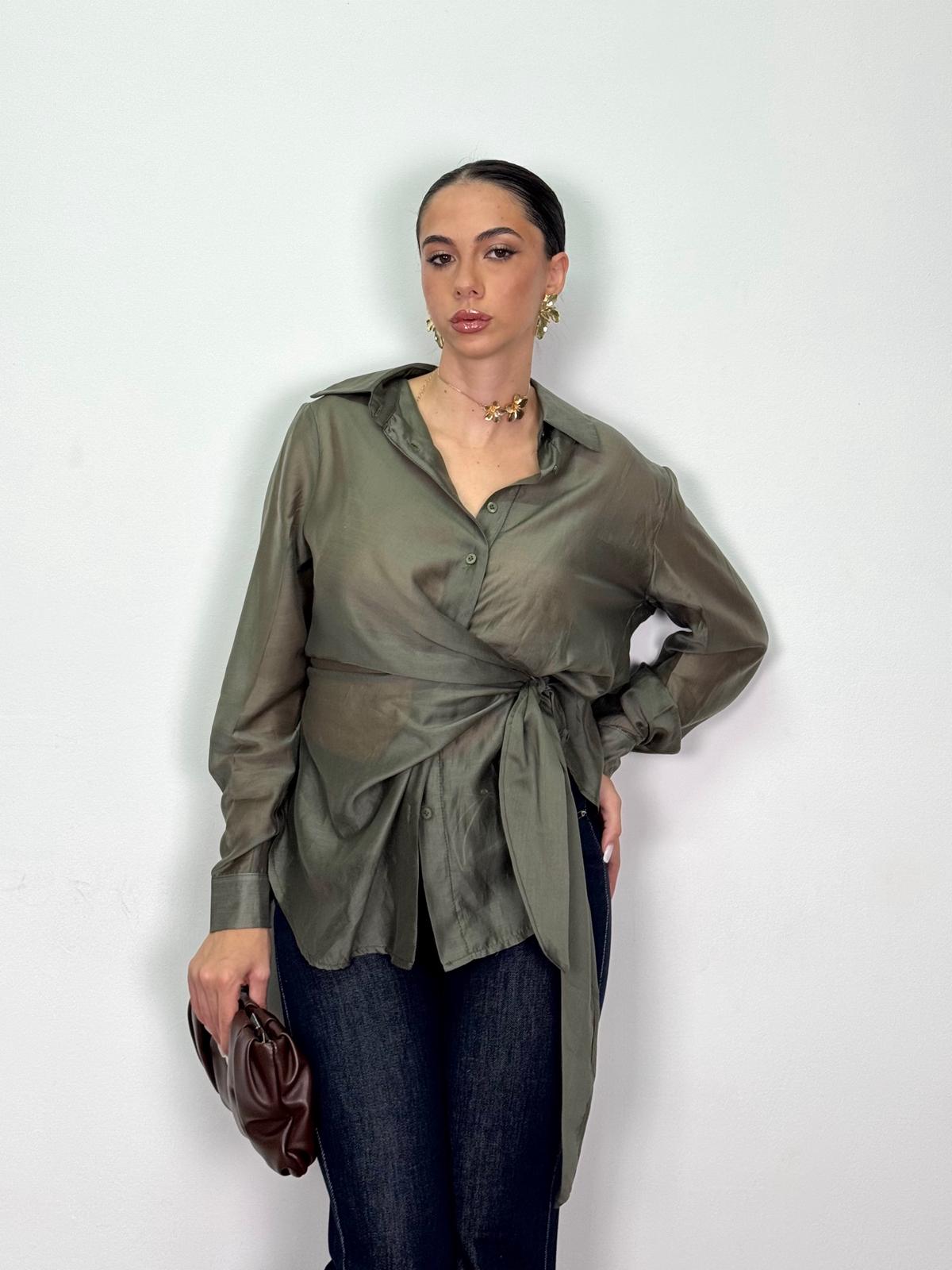 Camicia in tessuto fluido dal finish leggermente satinato, caratterizzata da un design moderno con nodo laterale che valorizza il punto vita. Il colletto classico e la linea morbida si fondono con il dettaglio asimmetrico, creando un capo versatile e sofisticato.