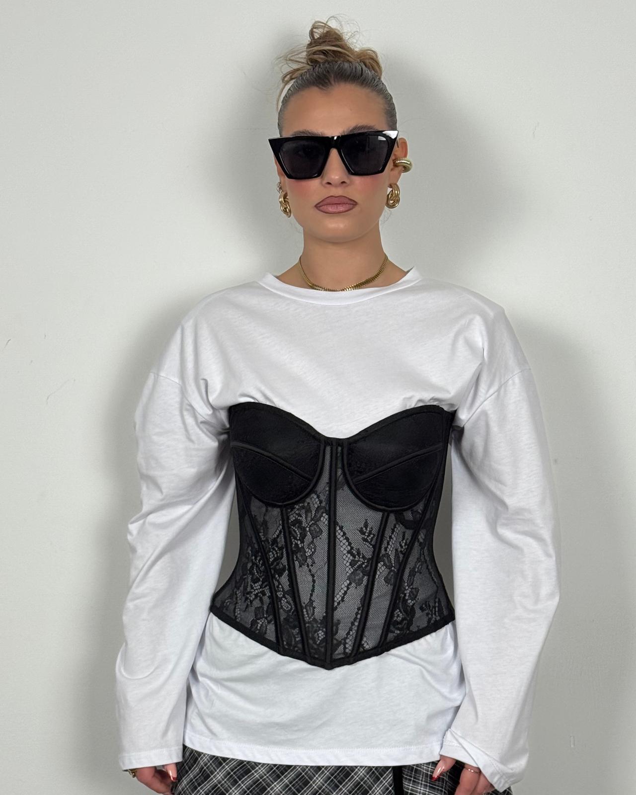 Il design a bustier con coppe sagomate dona sostegno e definizione, mentre l’effetto vedo-non-vedo aggiunge un tocco sensuale e contemporaneo. Perfetto da indossare sopra t-shirt, camicie o abiti per creare layering di forte impatto.