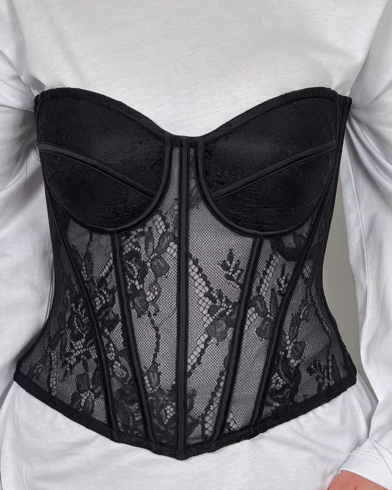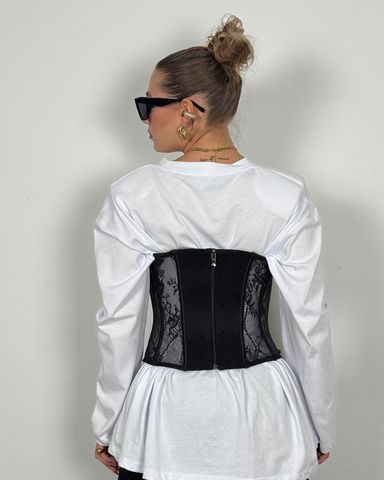 Audace, femminile e di carattere: il Corsetto Lace Icon è il dettaglio che trasforma anche il look più essenziale. Realizzato in pizzo semi-trasparente con struttura steccata, scolpisce il punto vita valorizzando la silhouette con eleganza decisa.