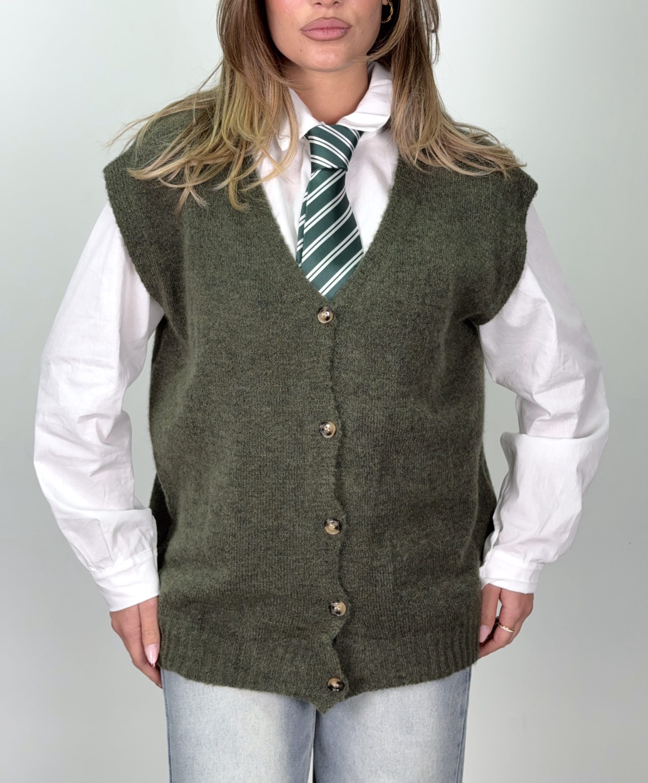 La tonalità oliva dona un fascino naturale e versatile, ideale per outfit casual-chic, mentre i bottoni frontali aggiungono un tocco retrò che richiama le atmosfere preppy e accademiche. Un must-have da indossare su camicie, dolcevita o top basic, sempre con stile impeccabile.