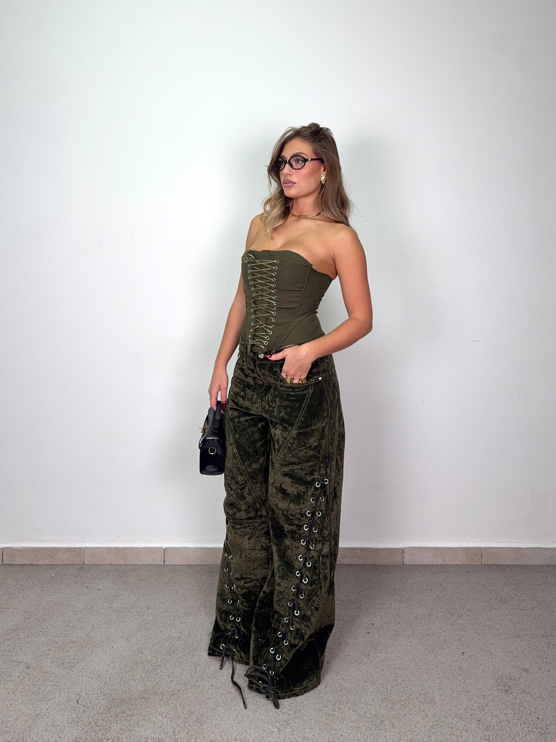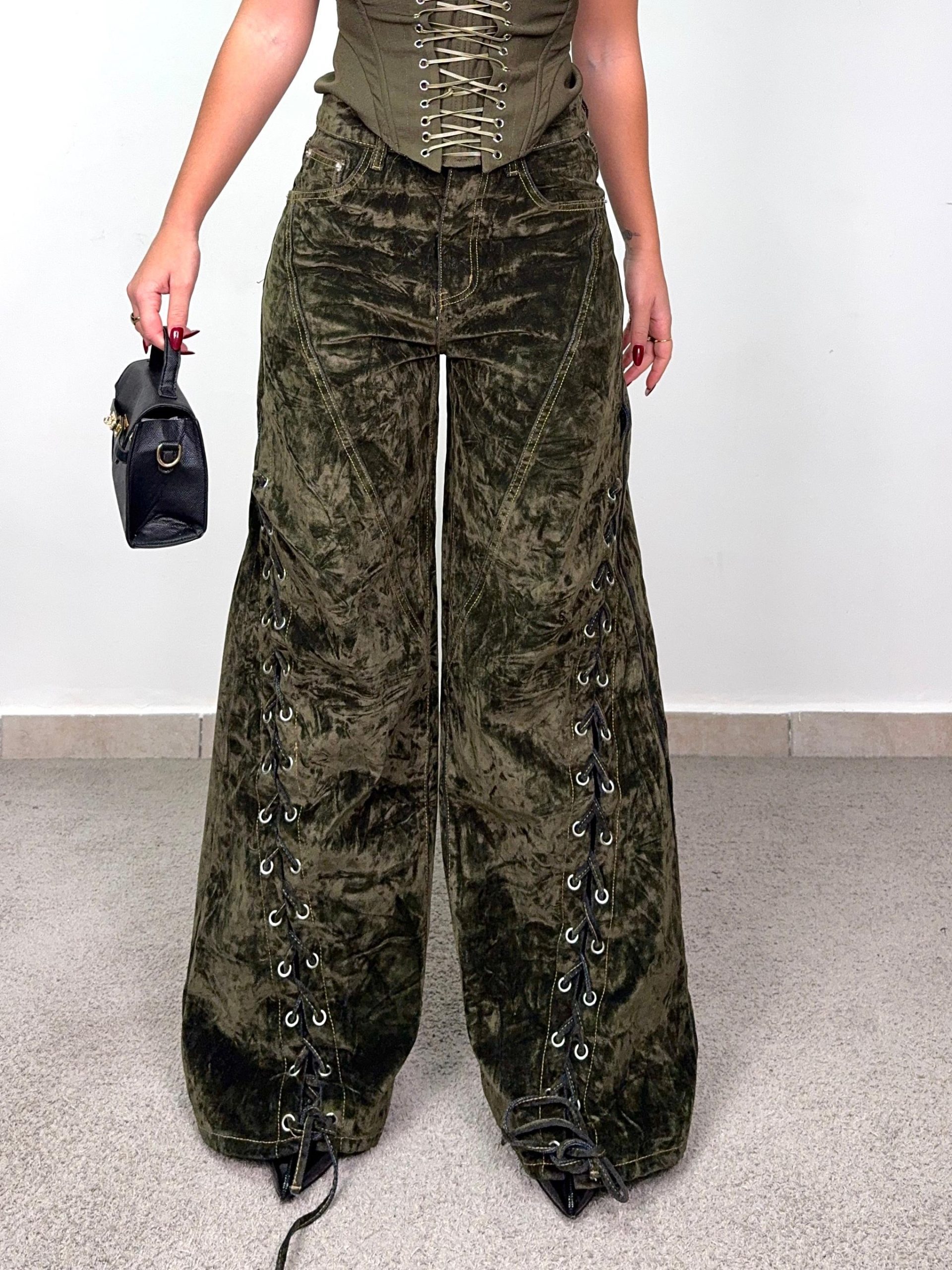 I dettagli con lacci regolabili lungo i lati aggiungono un tocco grunge e personalizzabile, mentre la vita alta con cuciture a contrasto e le tasche funzionali donano equilibrio tra stile e comfort.