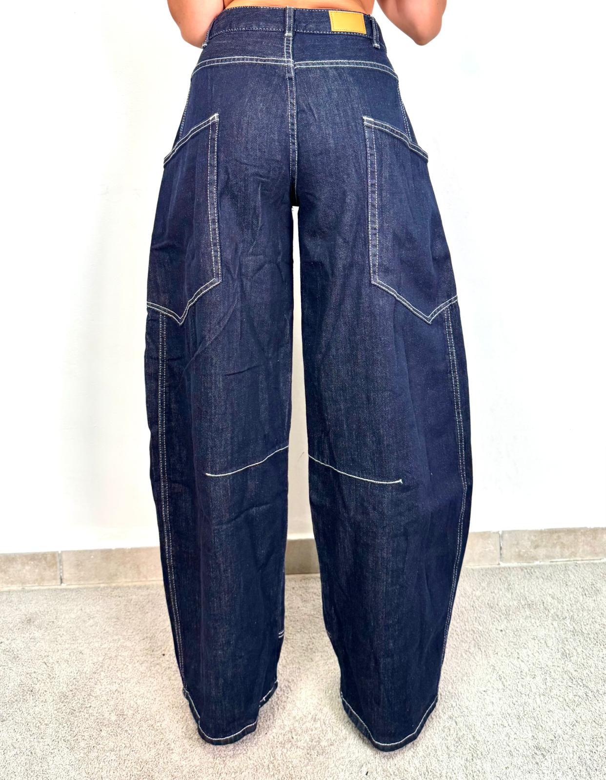 Jeans dallo stile contemporaneo, caratterizzati da una linea ampia e cuciture a contrasto che esaltano il design. Le maxi tasche laterali donano un tocco cargo, mentre il fit rilassato garantisce comodità senza rinunciare allo stile.