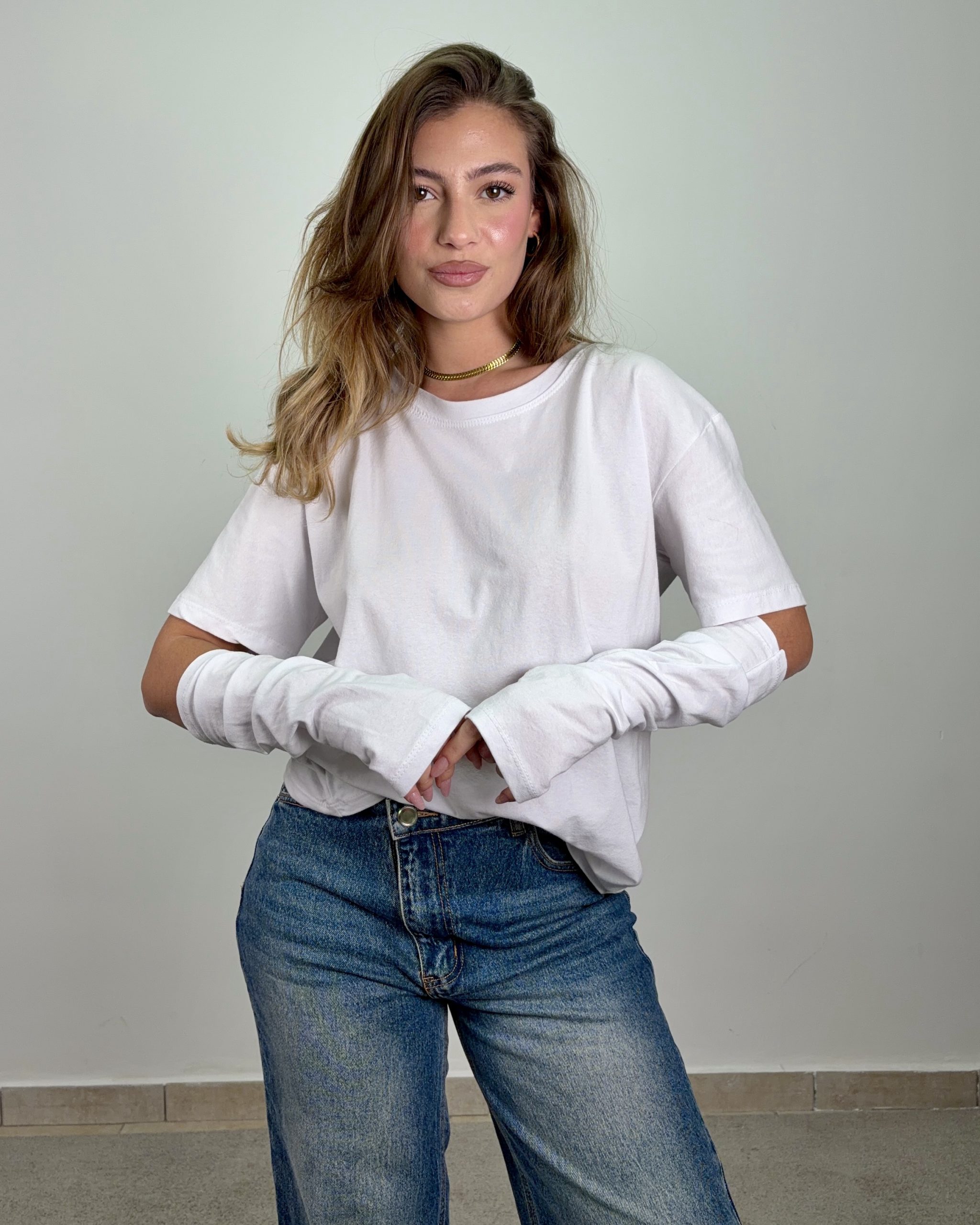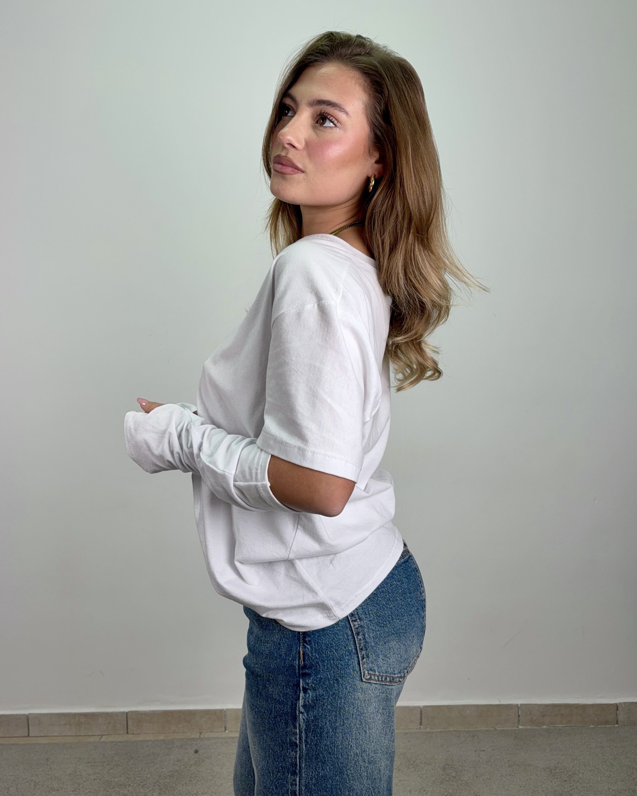 Pulita, versatile e senza tempo: la Maglia Basic White Essential è il capo indispensabile del guardaroba quotidiano. La vestibilità morbida e il design essenziale la rendono ideale per costruire outfit minimal ma curati, adattandosi con naturalezza a ogni stile.