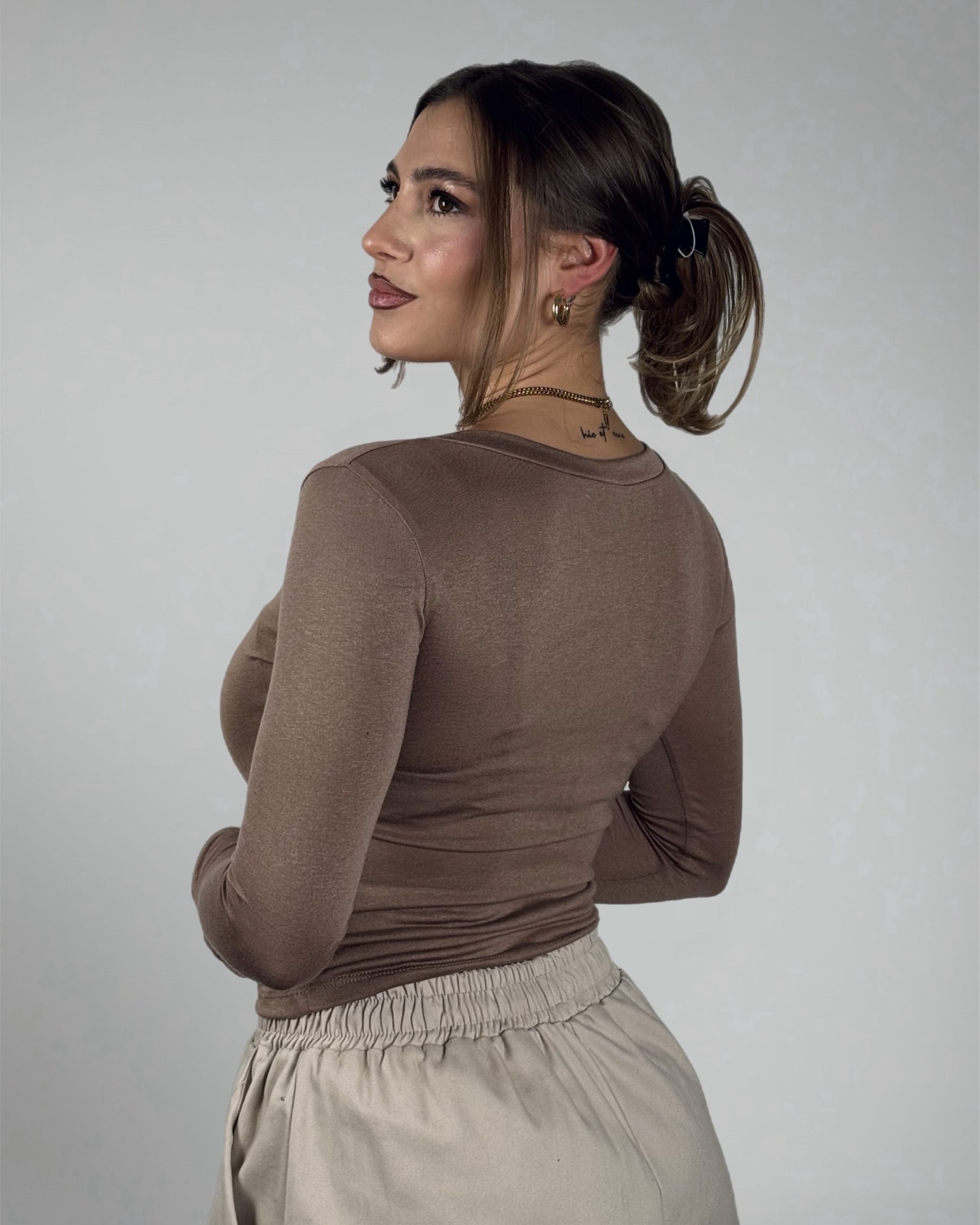 Maglia a manica lunga dal design essenziale e femminile, realizzata in tessuto morbido ed elasticizzato che valorizza la silhouette senza costringere. Il dettaglio dei bottoni sullo scollo aggiunge un tocco discreto ma raffinato, rendendola versatile per ogni momento della giornata.