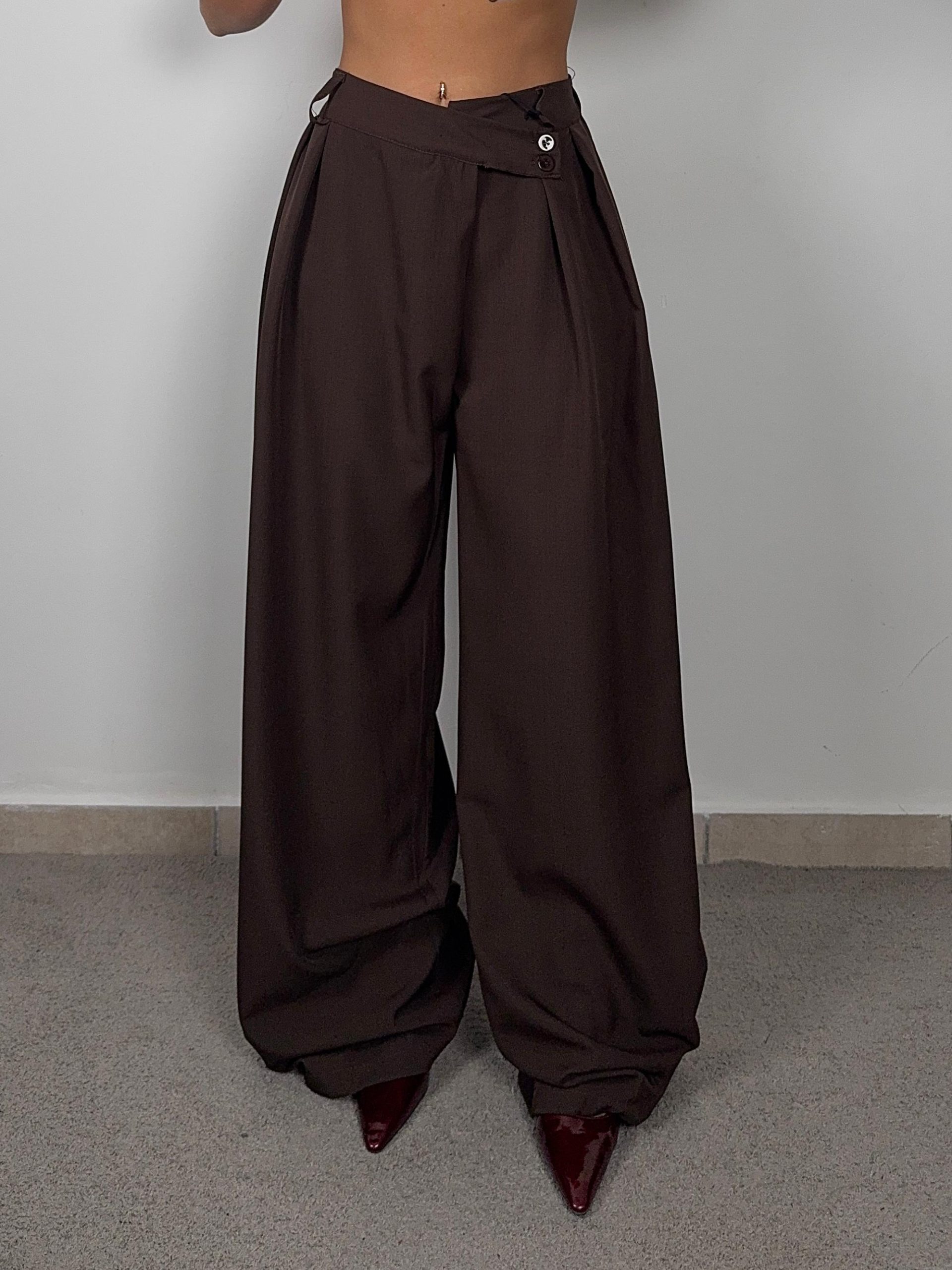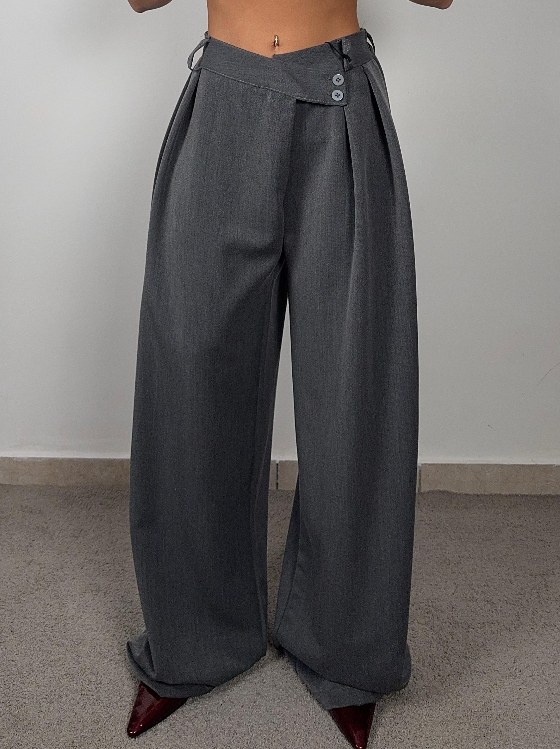 Il vero protagonista è il cinturino incrociato con doppio bottone, un dettaglio che scolpisce il punto vita e aggiunge carattere al design. Versatili e sofisticati, si abbinano a top aderenti, camicie essenziali e blazer oversize per look da giorno e da sera dal gusto impeccabile.