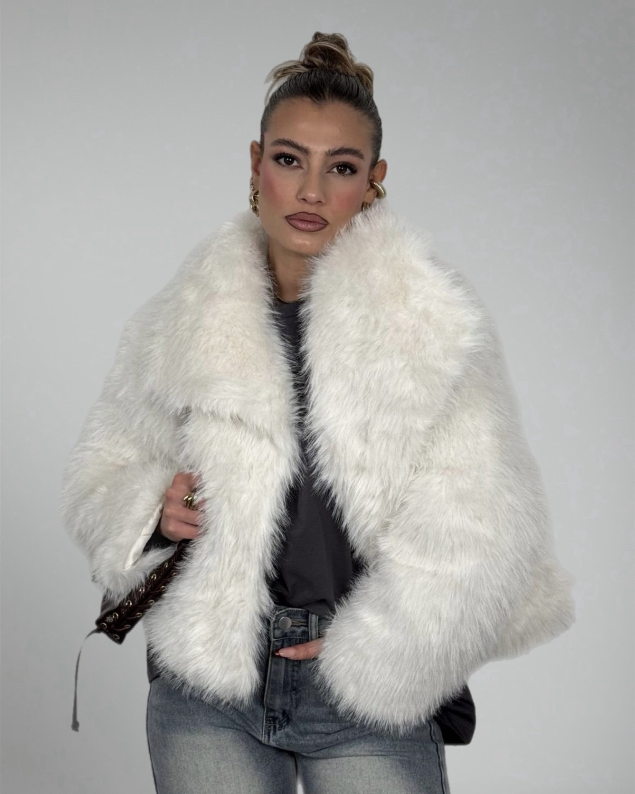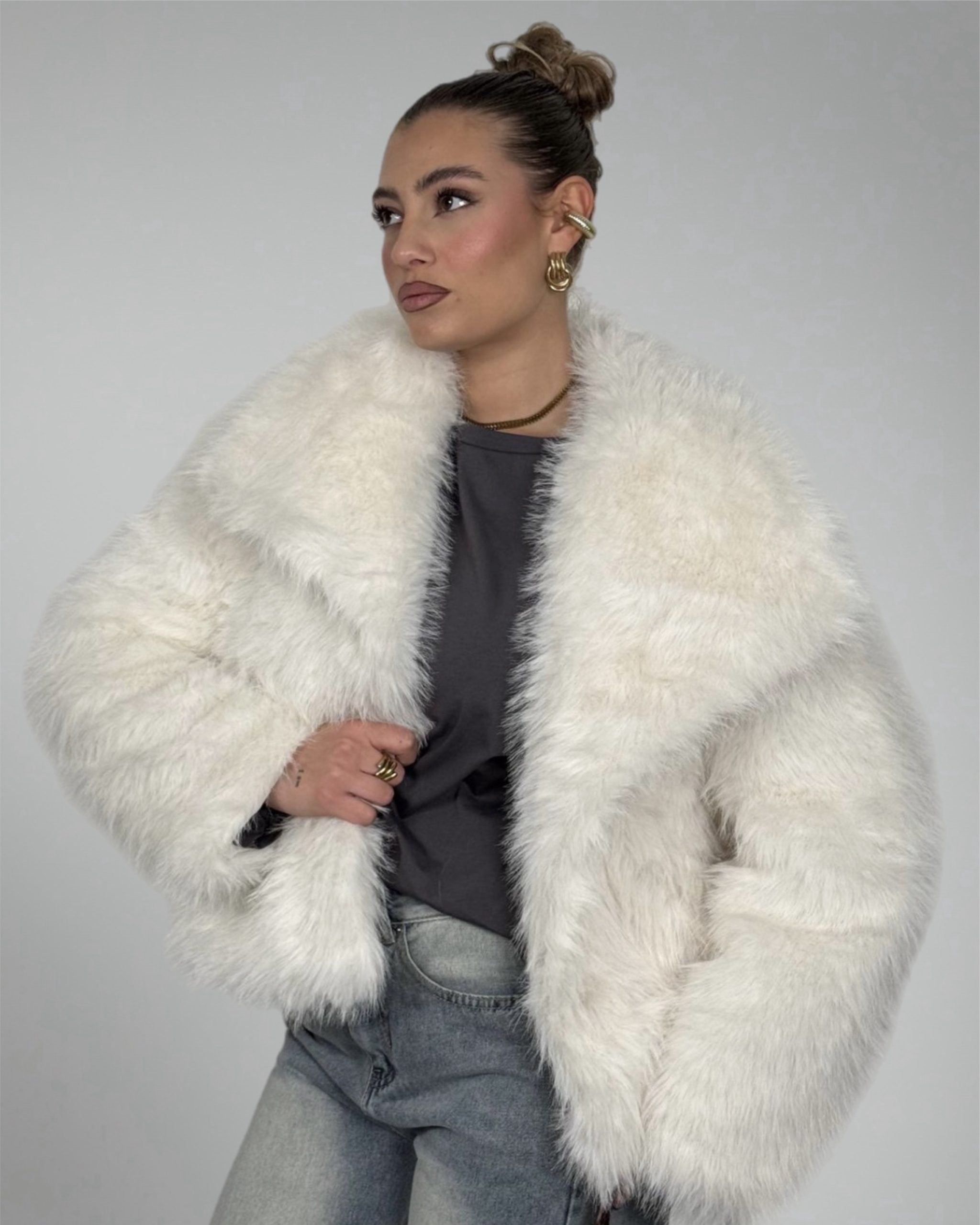 Il design corto e strutturato valorizza la figura, mentre il collo ampio e soffice incornicia il viso con raffinatezza. Perfetta sia per outfit casual chic con denim, sia per look serali più sofisticati.