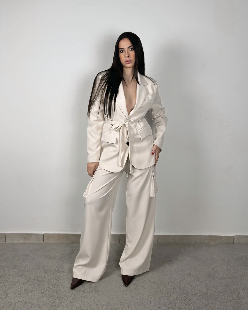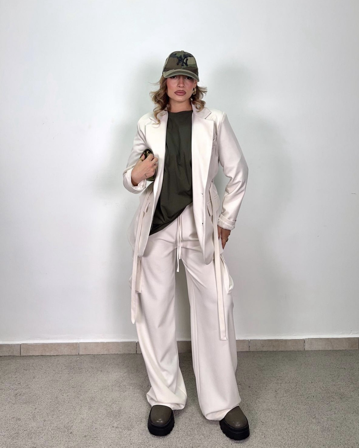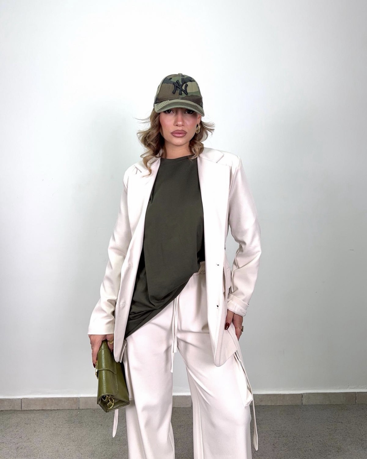 Il Tailleur Urban reinterpreta l’eleganza classica in chiave urban-chic. Realizzato in tessuto avorio fluido e strutturato, combina la raffinatezza del completo sartoriale con la freschezza dello street style. La giacca con cintura e i pantaloni ampi mantengono la silhouette elegante, mentre l’abbinamento con t-shirt e cappellino aggiunge un tocco contemporaneo e disinvolto.