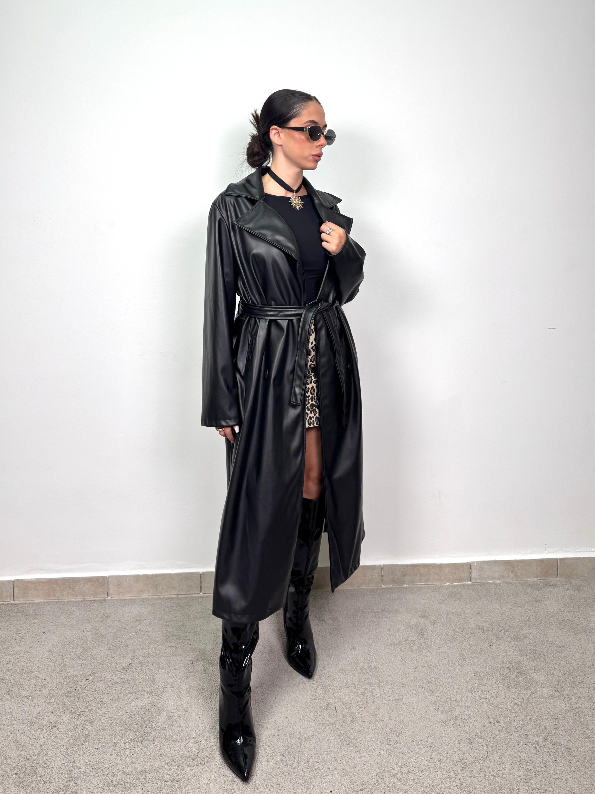 Realizzato in eco-pelle morbida e lucida, presenta una linea fluida e avvolgente, con cintura in vita per definire la silhouette e un taglio lungo che dona eleganza e mistero.